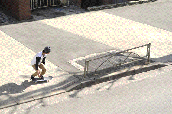 撮影する側としてワンスポットでいくつかのトリックを撮れることは、アングルを実験したり素材が増えたりで、何にしてもありがたいことです。いわゆる量産てやつですね。稜との撮影では、彼が最終目標とするトリックに達するまで幾つかのベーシックトリックを幾つもメイクする場合が多いです。この時もまずFs 50-50、F/s 50-50 Transfer、Fs Smithを各2トライ以内でメイクして、お目当てのFs Feebleに到達したのでした。なんてこった...!