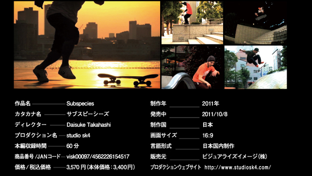 自分は、全国的な規模でのパートは初めてなので、こうして形になったことはすごいうれしいです。住んでるトコが遠いってのもあって、撮影はつねに撮り直しはない、2度目はないって思いでやってました。自分の中では、大ちゃんトコへ撮影しに行くってのが、ひとつの楽しみみたいになってて、けっこうハマってました(笑)。たまに行く、居酒屋タイムも好きです。なので、移動が大変だみたいのはなくて、滞在日数は多くとれないですが、しつこくおじゃまさせてもらいました。大ちゃんの地元の方々、いつも温かく迎え入れてくれて、あざっす。第2の故郷化してました(笑)。感謝感謝です。いろいろ話して、大ちゃんとは、スケボーに対する深い思いが、自分と似てて、ここまでやってこれたと思う。類は友を呼ぶ感じで。そんなみなさんひとりひとりのいろんな思い、出来事がつまった熱い作品です。『Subspecies 』作品完成おめでとう&お疲れさんでした。大ちゃん、落ち着いたら、あそこ行きましょ(笑)