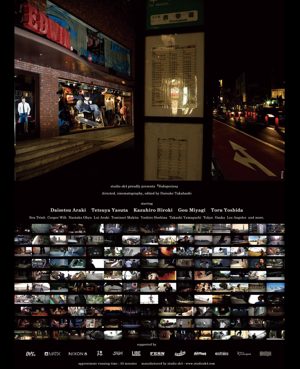 5年以上の製作期間をかけて完成させた今回の『Subspecies』で自分のパートが持てたことをスケーターとしてとてもうれしく思っています。自分のパートを実際見るまでどんなパートに仕上がってるのか想像も出来なかったし、とりあえず撮影に行ってやるかやられるかの繰り返しでした。東京のストリートは本当に厳しい撮影が多いし、トリックやスポットの難易度も上げて撮り逃してしまったこともしばしば。『Subspecies』の撮影には長い年月がかかっていて、いろんな状況での撮影をしてきた。頻繁撮影できた時もあれば、仕事やライフスタイルの違いで撮影のタイミングにならない時期もありました。23歳頃のフッテージから28歳の現在に至るフッテージがあり、映像ひとつひとつに深い思い入れがあるしひとつひとつ自分らしい動きで表現できたんじゃないかと思っています。