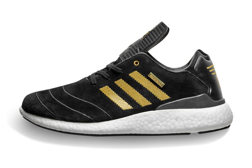 サッカーシューズをモチーフにしたBusenitzモデルの特徴的なアッパーとBoostフォームを採用したソールのデザインが特徴的なデザイン。ブラックのアッパーにゴールドが映えるプレミアムな1足は見かけたら即ゲットが基本です。