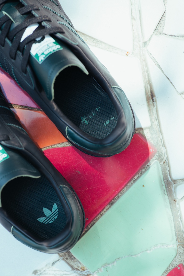 三本木のスケートとサッカーへの情熱を表現したクラシックな1足。ブッラクレザーのアッパーに配されたアンダーレイのナイトグリーンがポイント。タンには'80年代のレトロなデザインを採用し、インソールには本人のメッセージが記されている。CAMPUS ADV × SHIN ¥11,000