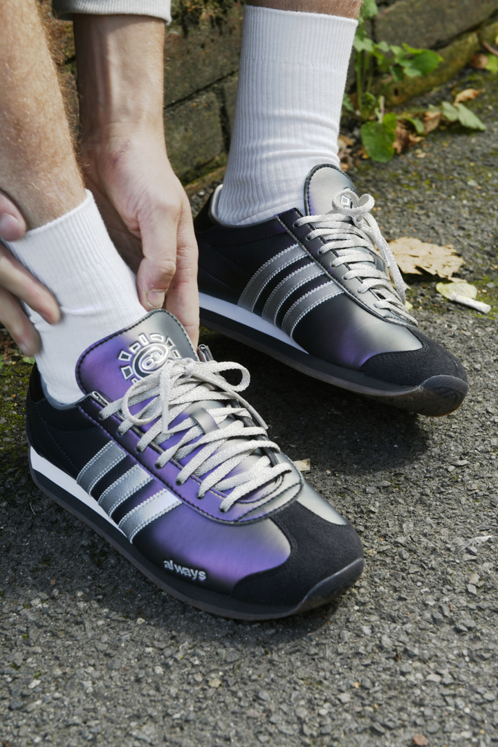 角度によって表情が変化する玉虫色の素材を採用。アッパーとタンにalwaysのロゴを配したスペーシーなモデル。Country × always ¥18,700