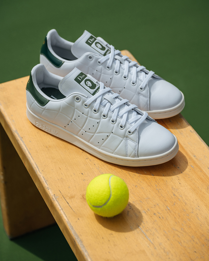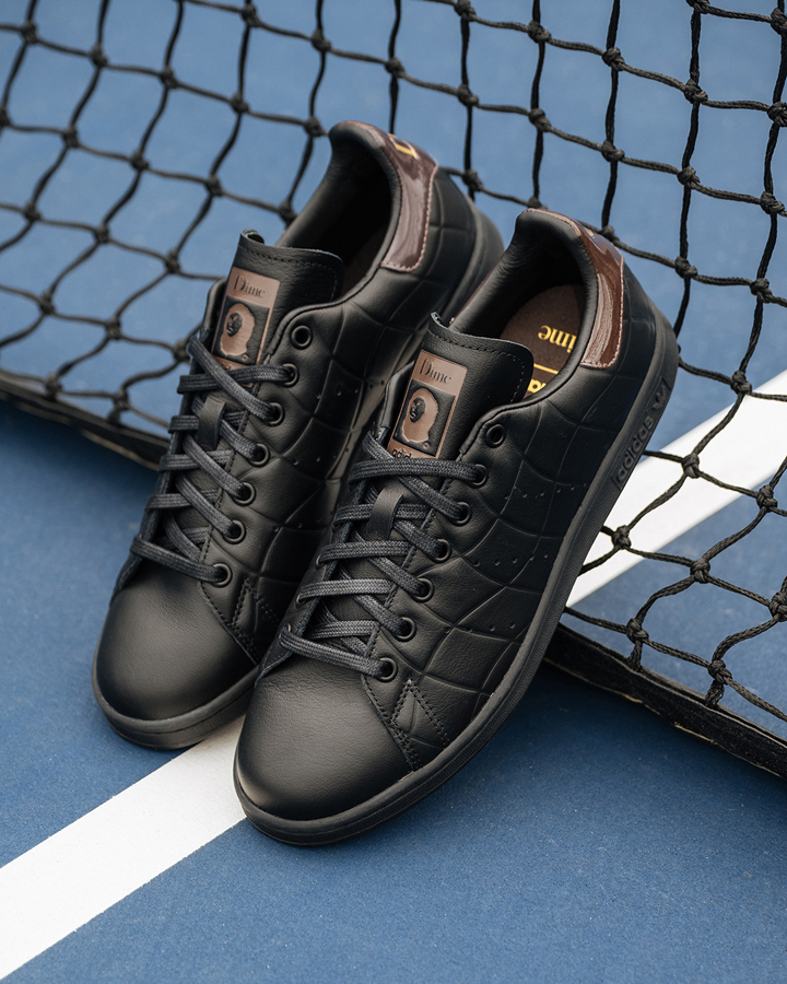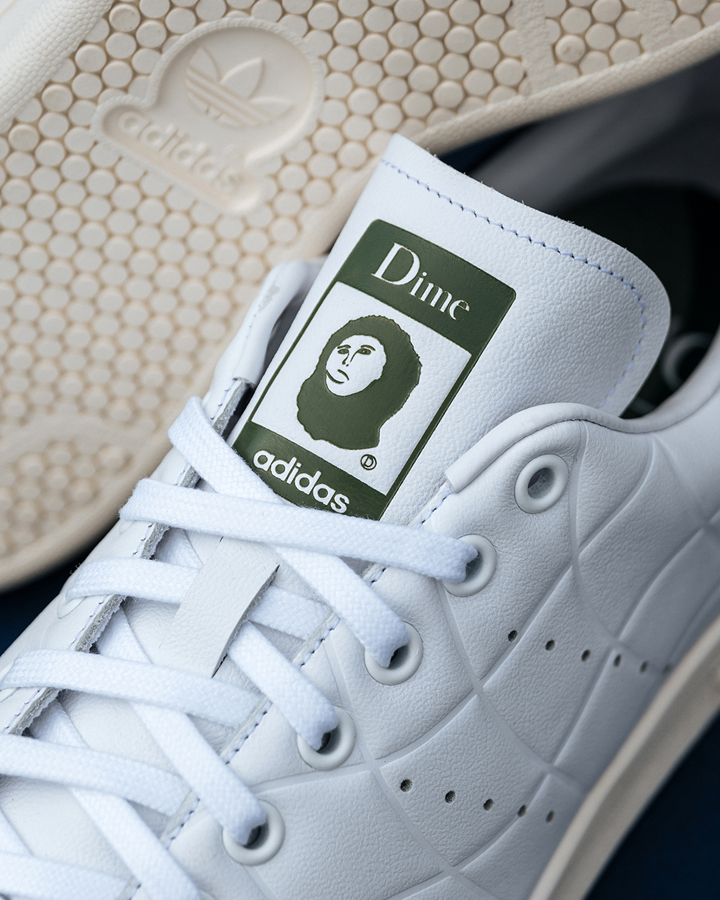 ウェイビーなラインでクラシックなスタイルをグレードアップ。内側と外側にキルティングの波型模様でアクセントをつけ、ヒールにゴールドフォイルでDimeロゴ。シュータンには修復に失敗した、かの有名な絵画をモチーフに。Dime Stan Smith 各色ともに¥18,700