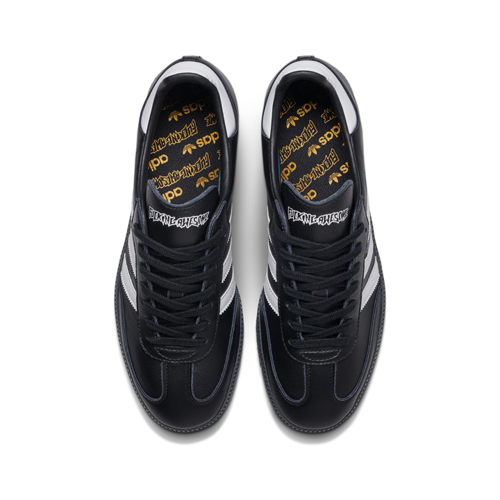 デボス加工のFAロゴをシュータンにオリジナルなFAのイラストをソックライナーにあしらったモデル。ブラックのフルグレインレザーアッパーにホワイトのストライプスを際立たせたデザイン。FAらしいタッチをさりげなく漂わせたクリアブラックアウトソールもユニーク。¥16,500