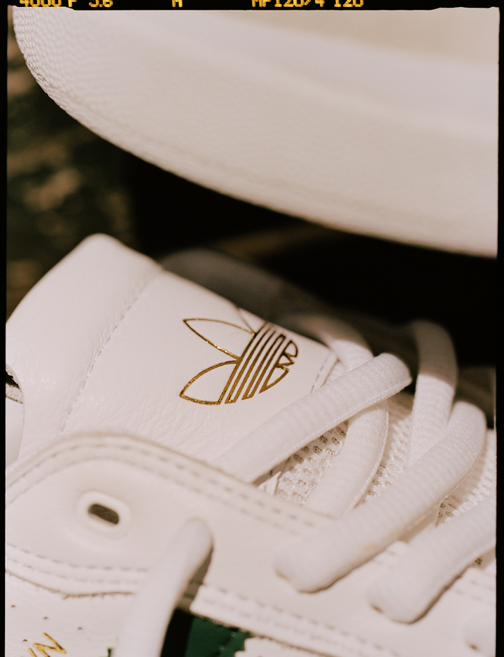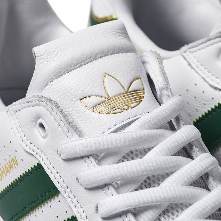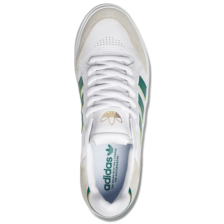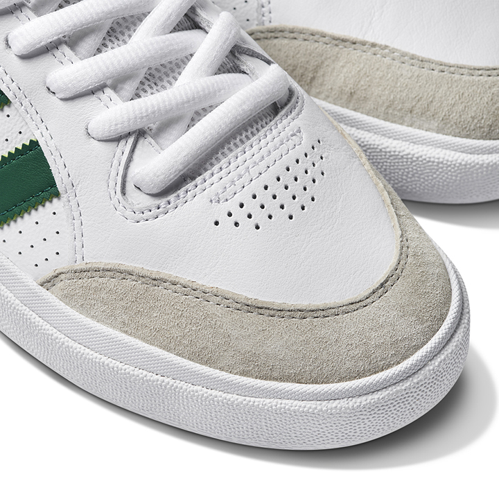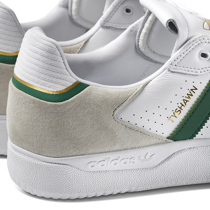 プレミアムホワイトレザーにグリーンのスリーストライプスが映える。スエードのトゥキャップで耐久性も向上。Tyshawn Low ¥12,100(税込み)
