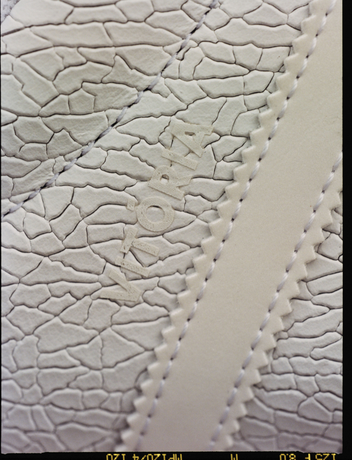 アッパーのひび割れたホワイトレザーはアスファルトやスケートスポットの荒れた路面がインスピレーション。