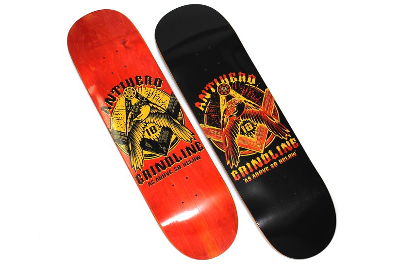 Grindlineとのコラボデッキ。写真左から、チームモデルのOrange(8.25×32)、Black(8.75×32.75)。ともに¥10,800