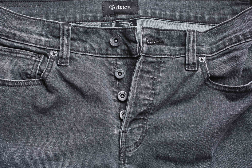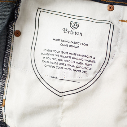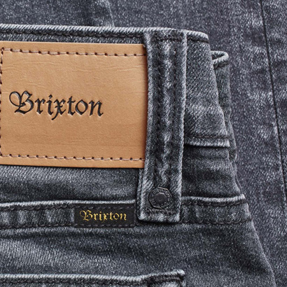 カスタムワンピース型のスタックボタン、ベルトループリベット、Brixtonシールド型のコインポケットなど豊富なディテールがポイント。