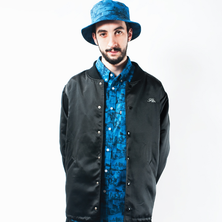 ・ブライス・カナイツの写真のコラージュをライニングに使用したコーチジャケット SFC Team Jacket ¥24,840、ジャケットのライニング同様、フォトコラージュ生地を使用したバケットハット Allover Hat ¥7,344