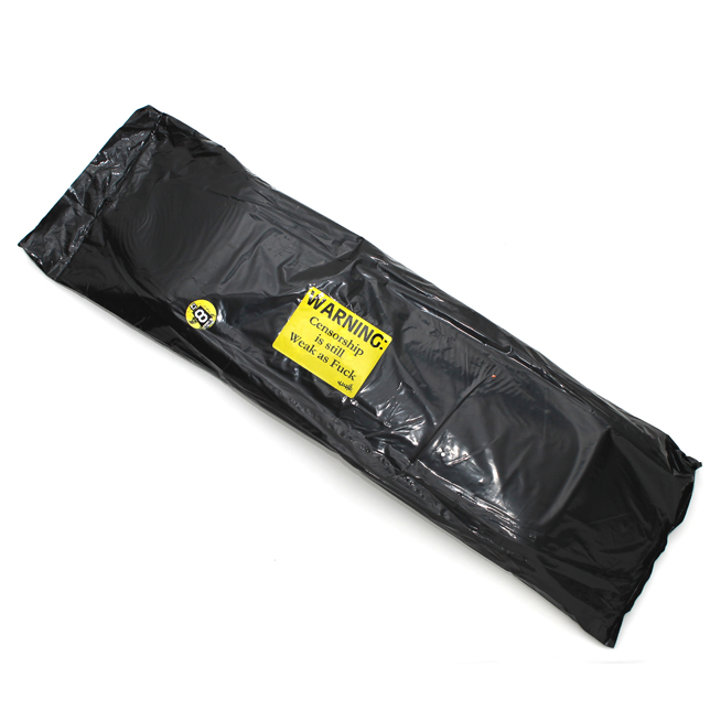 ・過激なグラフィックのため、黒いビニール袋にパッケージされたまま販売されるこちらのデッキ、「Censorship is still Weak as Fuck(検閲なんてクソ食らえ)」のステッカーが主張する。