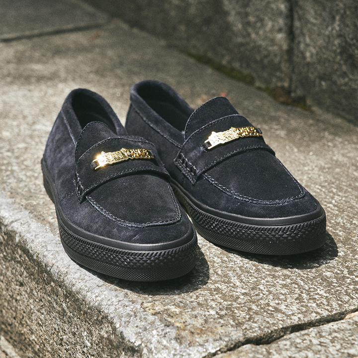 NYCを拠点に国内外で活躍するアーティスト、トウヤホリウチ氏とのコラボモデル。CS LOAFER SKをベースに、スエードアッパーを採用したシックなオールブラックモデル。単色のシューズで一際存在感を放つNEW YORKのメタルパーツがアクセント。インソールやボックスにはアーティストがアレンジしたさまざまなCONVERSE SKATEBOARDINGロゴがレイアウトされている。
