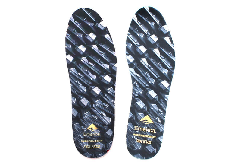 インソールにはトラックのベースプレートの総柄を採用。両ブランドのロゴに加え、フィゲロアとロメロの名前がプリント。