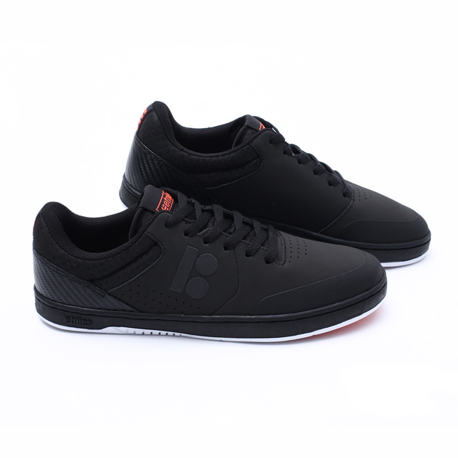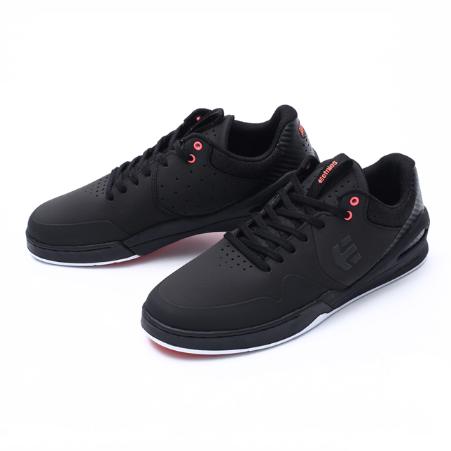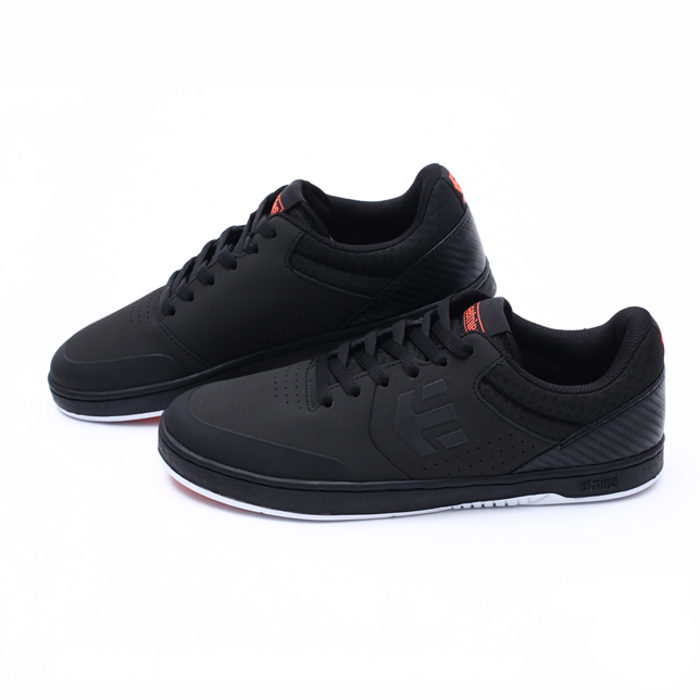 01、02 マットブラックのアッパーに蛍光オレンジのロゴマークが主張するPlan B Marana。カカト部分に採用されたカーボン柄の素材がテンションを高めてくれる。左右それぞれにetnies、Plan Bのロゴが入る ¥11,880