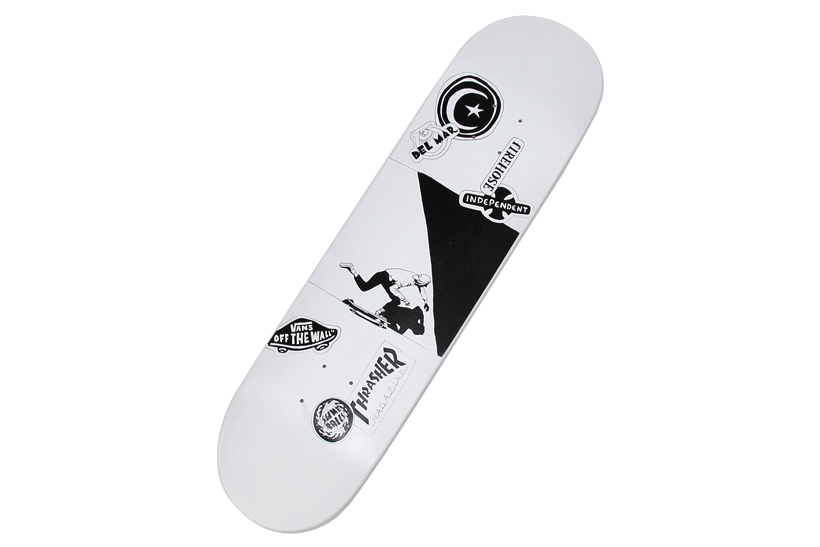 ホワイトのボードに描かれた味のあるイラストとThrasherやIndy、Vansのロゴがインパクト抜群。