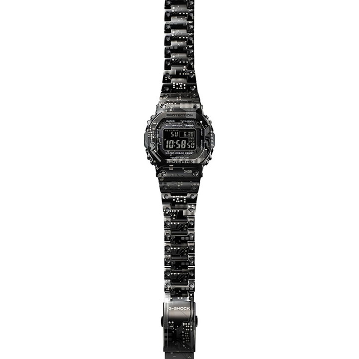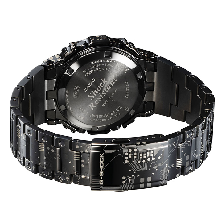 純チタンの2倍の硬度を持つチタン合金TranTixxii®を採用。ブラックIPとレーザー刻印で搭載されているモジュールのサーキットボード柄を表現。