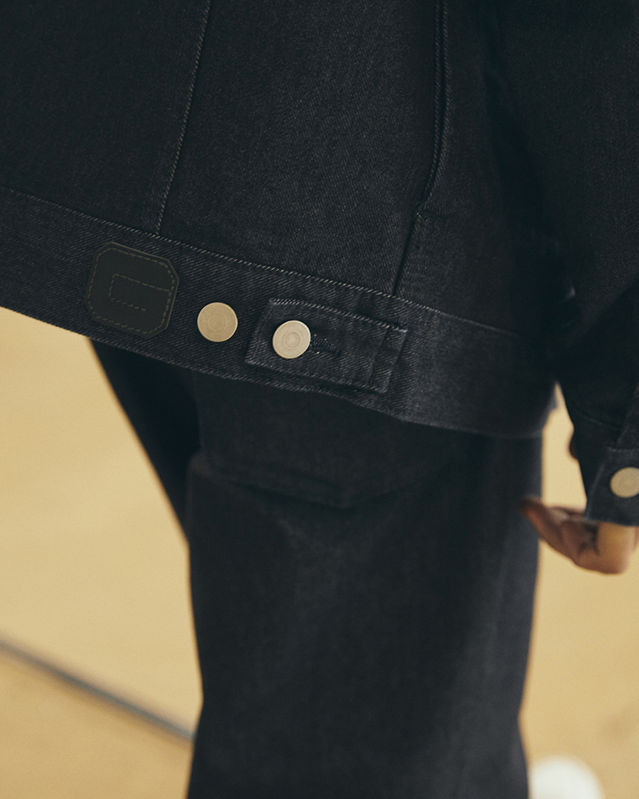 袖を捲らずに時計をチェックできるギミックを採用したデニムジャケット。ガジェット用のポケットをフロントの左右非対称にレイアウト。CORDURA DENIM TRUCKER JACKET ¥29,700