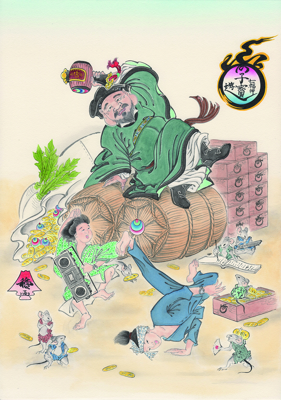 GX-56モデルをベースに採用した大黒天モデル。バンドに打出の小槌とネズミ、遊環に小判をプリント。GX-56SLG-1JR ¥24,840