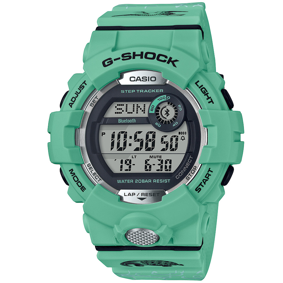 バンド部分に松の総柄パターンを採用。鶴や亀などの縁起物もプリントされた福禄寿モデル。 GBD-800SLG-3JR ¥19,980