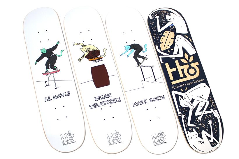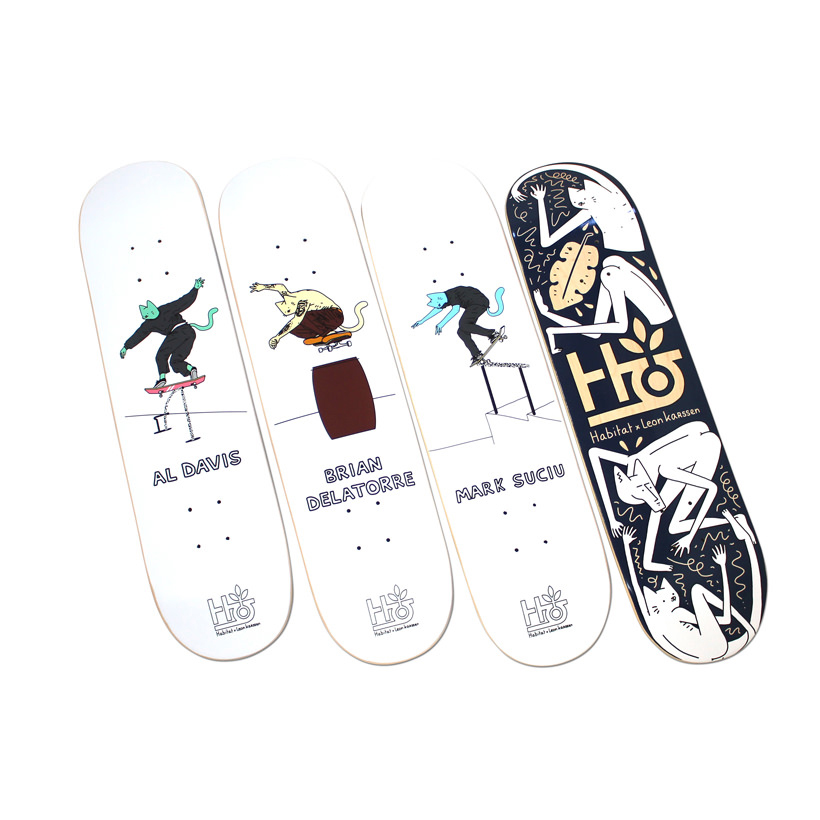 Habitat × Leon Karssenとのコラボデッキ。写真左から、Davis × Leon(7.75×31.25)、Delatorre × Leon(7.875×31.625)、Suciu × Leon(7.875×31.625)、Leon Karssen(7.75×31.25)。すべて¥11,880
