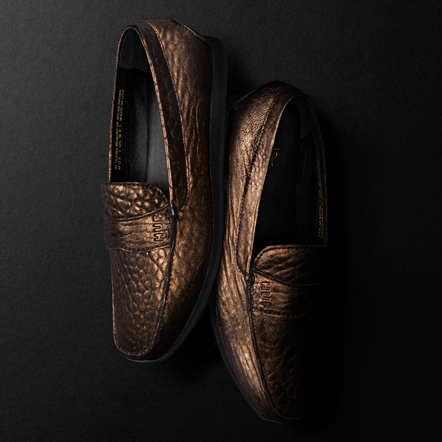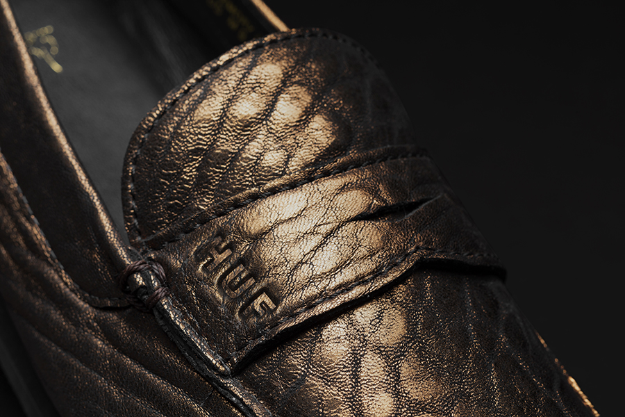 フルグレインのメタルレザーを採用したアッパーにはHUFのロゴを刻印。