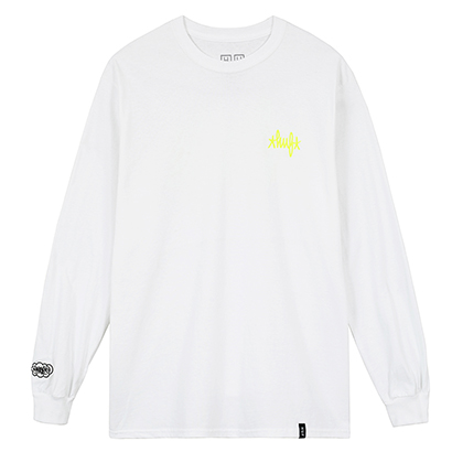 フロントの左胸とバックにロゴプリントを施したL/S Tシャツ。HAZEのロゴワッペンを右袖にオン。各色ともに¥6,696