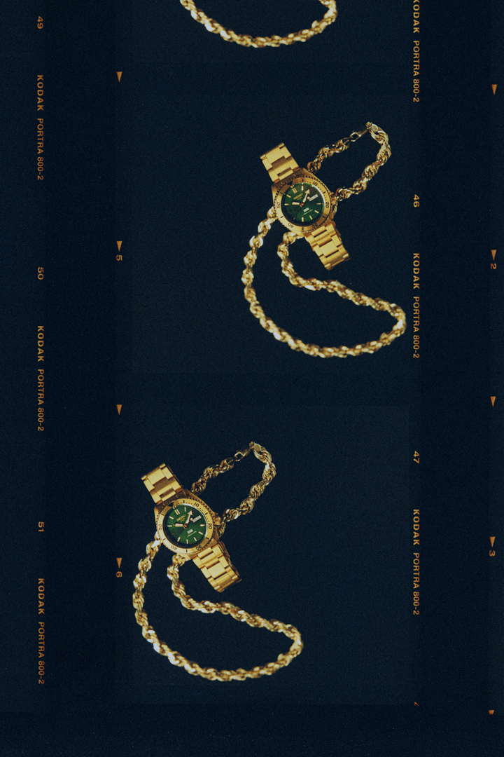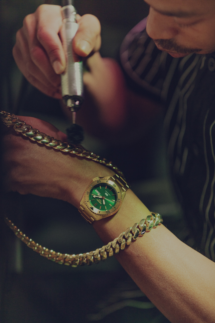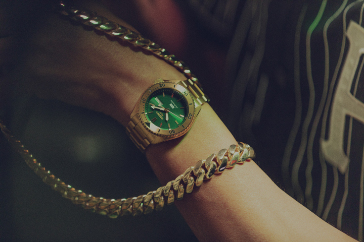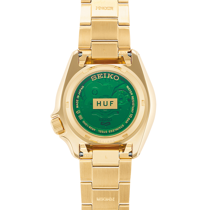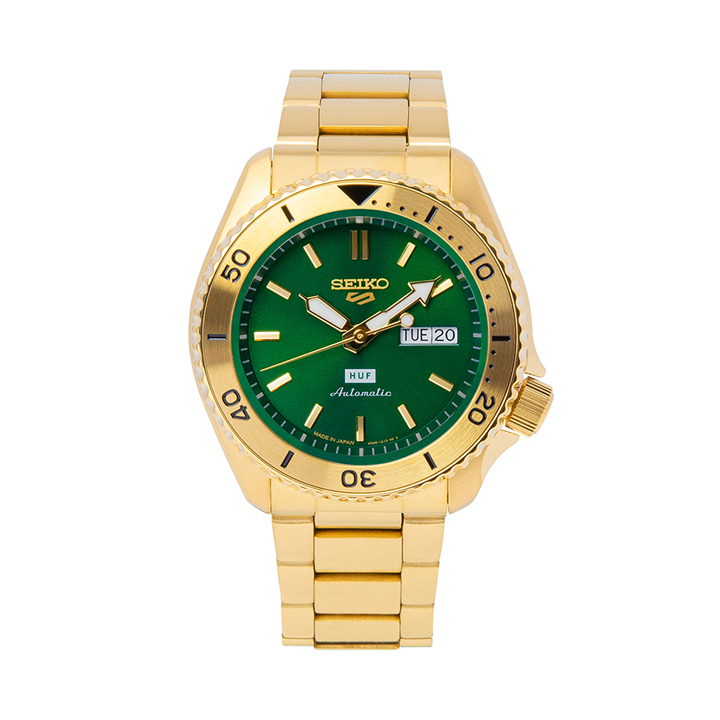 グリーンダイアルとの色の対比が美しいゴールドケースモデル。Seiko 5 Sports × HUF Gold ¥47,300(※こちらは一部のHUF Flagship Storeでの販売)