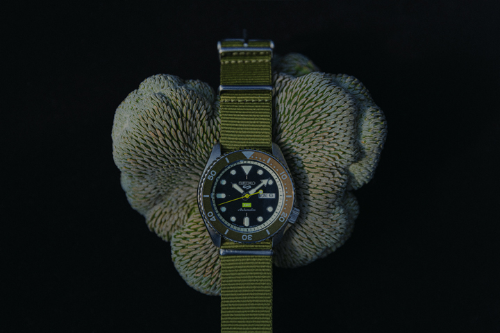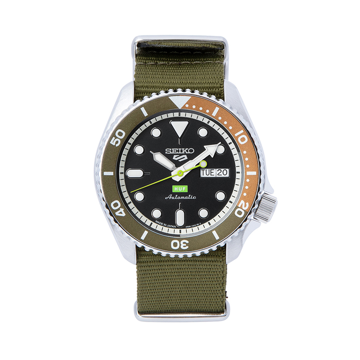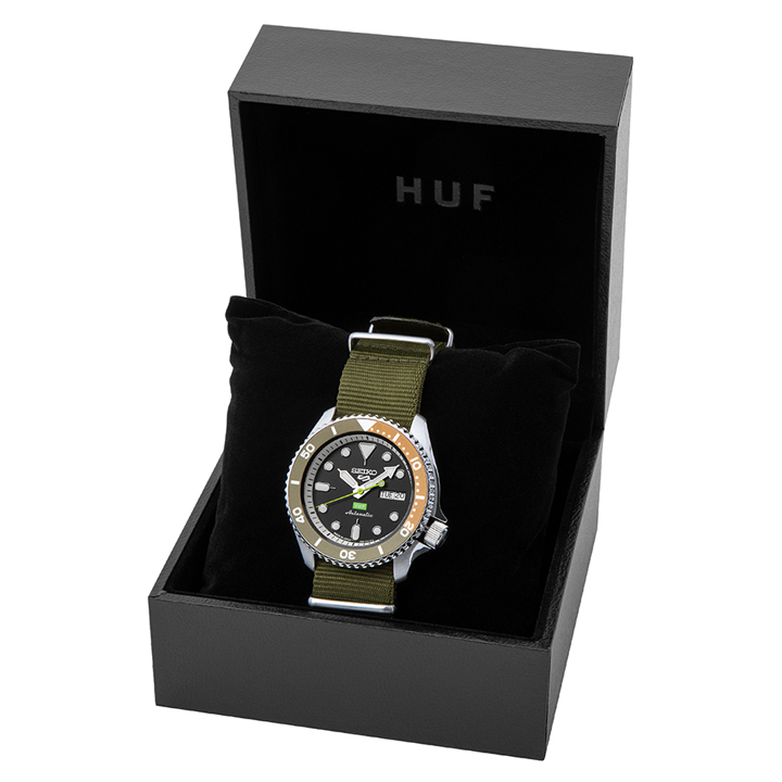 クラシックなフィールドウォッチのイメージに、アクセントとして秒針とロゴにHUFグリーンを採用。Seiko 5 Sports × HUF Olive ¥42,900