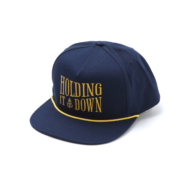 ・ネイビーのボディにイエローのプリントと飾り紐が色鮮やかなスナップバックキャップ。¥4,320