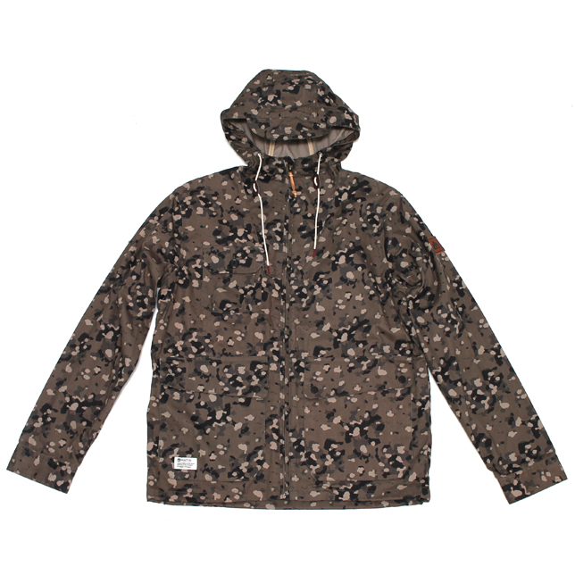 ・オリジナルの迷彩柄を用いたミリタリーテイストあふれるフードジャケット。ワックスコーティングを施したコットンスラブヘリンボーン生地が風雨を防いでくれる。Pacer JK ¥25,920