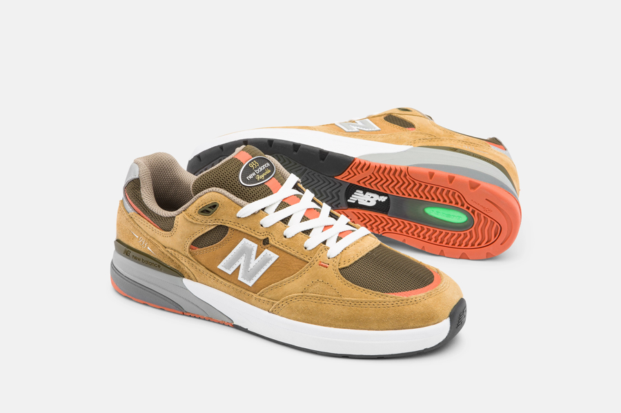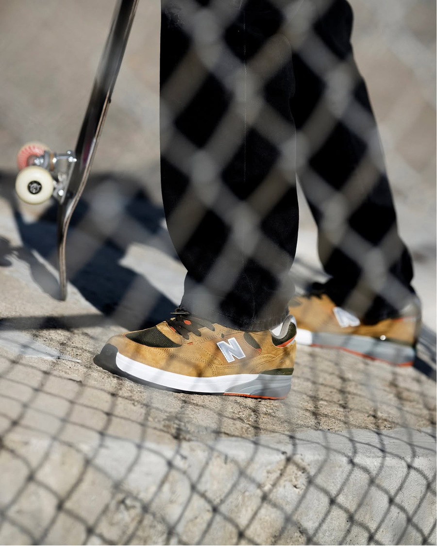 New Balanceの最新ランニングテクノロジーでスケートに必要な機能を実現。異なる硬度を組み合わせたフルレングスの“ABZORB”ミッドソールを採用し着地時の衝撃を緩和。さらにPRIMO PLATEが予期せぬプリモから足裏を保護。ガゼットタンが足のブレを抑え、“Fantom Fit”が高いフィット感を実現。さらにCONTROLLED REACTION DEVICEヒールカウンターで着地時の安定性を向上。NM933MNO(Wheat)/NM933BST(Black/Olive)各色ともに¥22,000