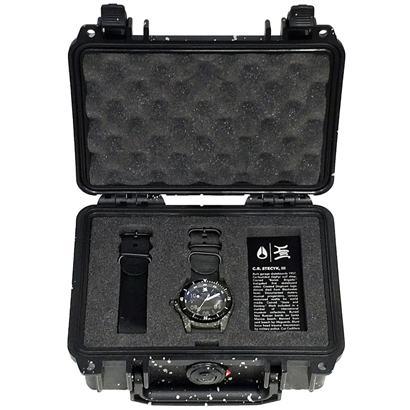 ステシックによるペイントが施された丈夫なPELICAN製のプロテクターケースに時計は収納されている。