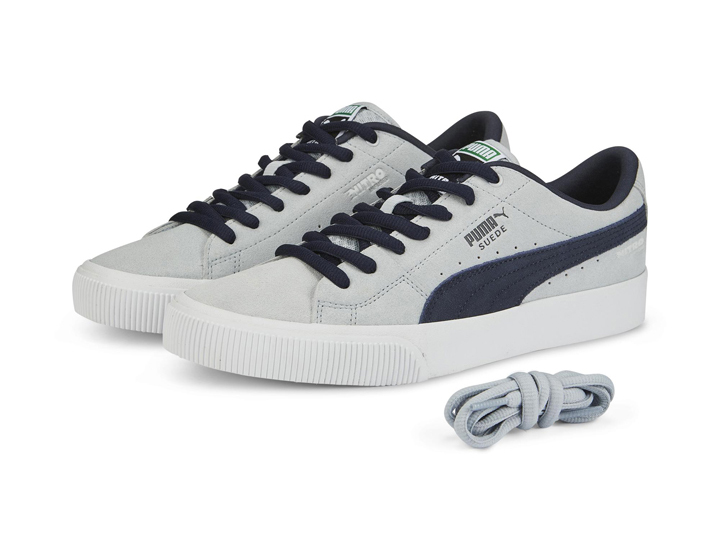 オーリーで摩耗する部分にアッパーと同素材であるスエードの補強が特徴。Nitroフォームに加え、タン部分には動きやすく通気性に優れたメッシュ素材を採用。Suede Skate Nitro プラチナ グレー¥10,450(10月22日発売)