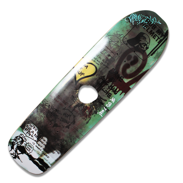 ・落書きが施された壁のグラフィックのクルーザーデッキ(8.75×32.875)はトイレをモチーフにしたSkate Mental × HUFの世界限定200本のコラボレーションデッキ。アメリカのゲトーな公衆トイレの男子トイレと女子トイレの間の壁にはこんな穴が開いており、アレを入れるとアレしてくれるのだとか…詳細は以下の動画をチェック! こちらもデッキテープ付き。¥11,880