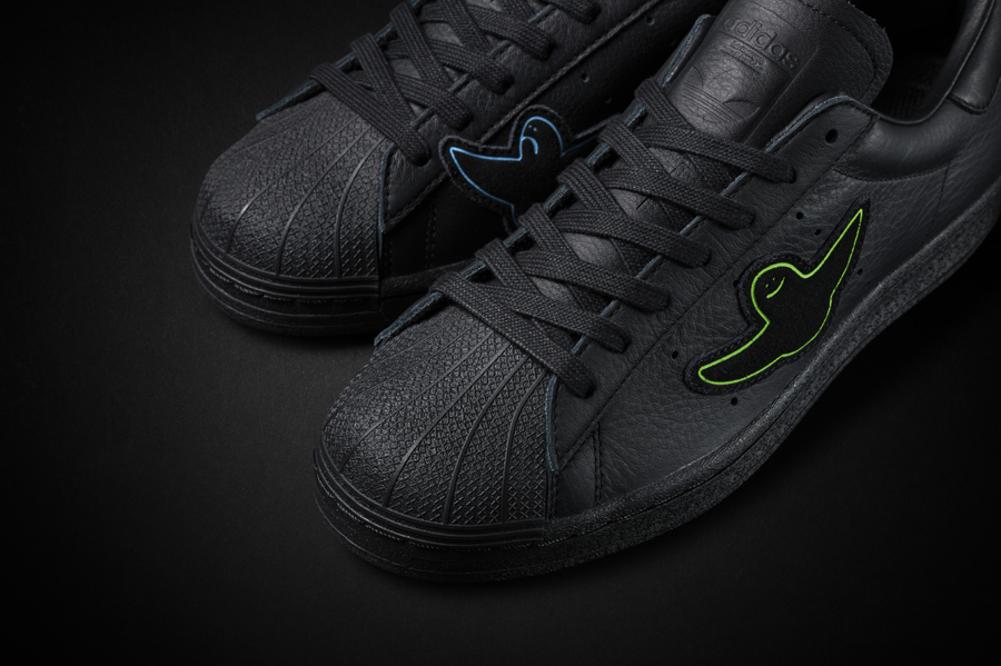 上質なフルグレインレザー素材のブラックアッパーにパンチング加工のスリーストライプス。サイドにはブラックに映えるネオンカラーをあしらったShmooのスウェードパッチがON。Superstar ADV by Mark Gonzales ¥13,200