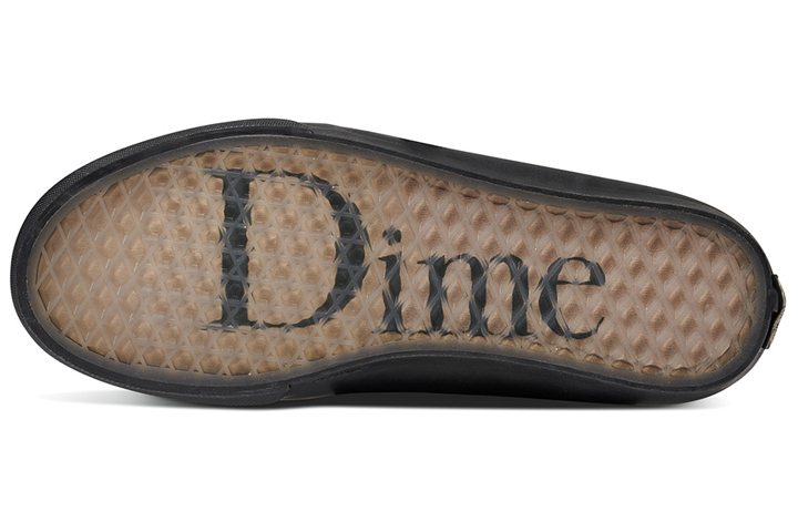 ブラックのライニングやソールがアイテムを引き締め、クリアのアウトソールにはDimeのロゴがプリントされている。