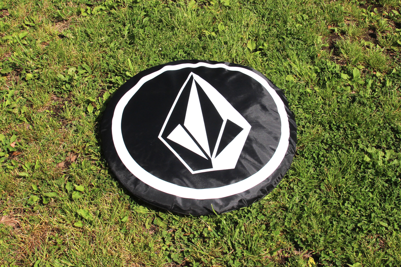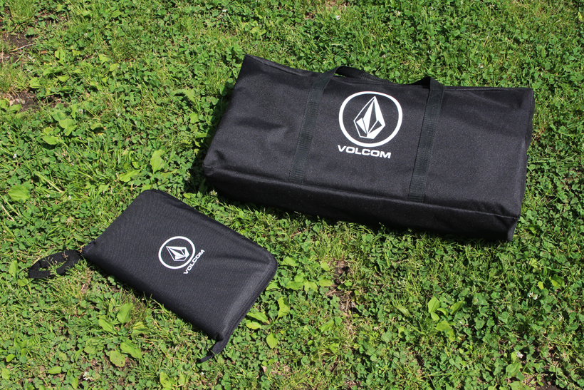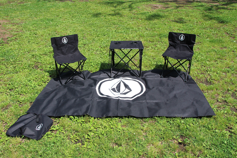 折りたたみ式の椅子2脚とテーブルセット。Volcom Beach Chair Set ¥7,992、使わないときはポーチサイズになるパッカブル仕様のピクニックシート。Volcom Picnic Sheet ¥5,832