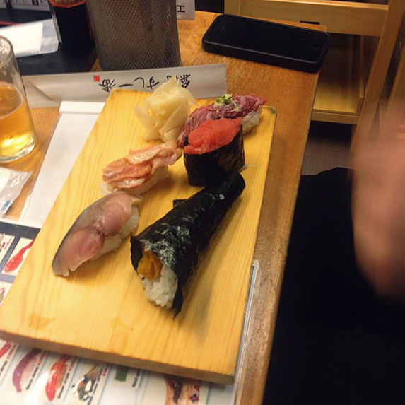 Back in Tokyo we had sushi at Tsukiji fish market. Aksel felt adventurous, so he decided to place an order from the Japanese menu (with no translation help from Ballo). He ended up with mackerel, a mussel of some kind and horse meat (which was very exotic). He loved it. Sushi surprise.