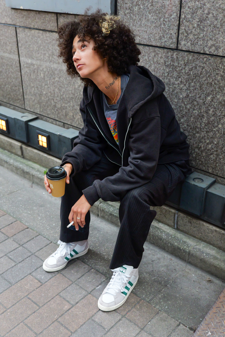 ADIDASが展開するSUPERSTARにフォーカスしたツアーで来日したジェン・ソト。撮影前の朝、静かなホテルのロビーで笑顔を浮かべながら取材に応じる姿が印象的だった。今回のツアーで撮影されたクリップで構成される映像作品がどのような仕上がりになるのか。期待が高まるばかり。