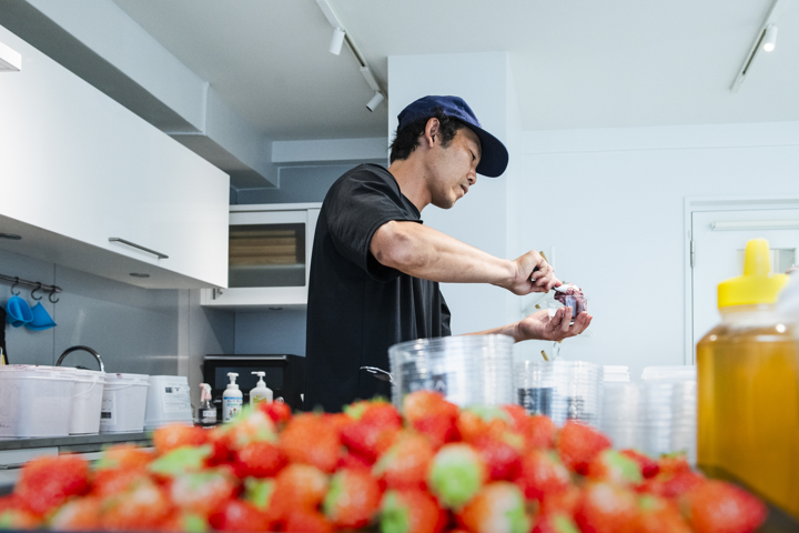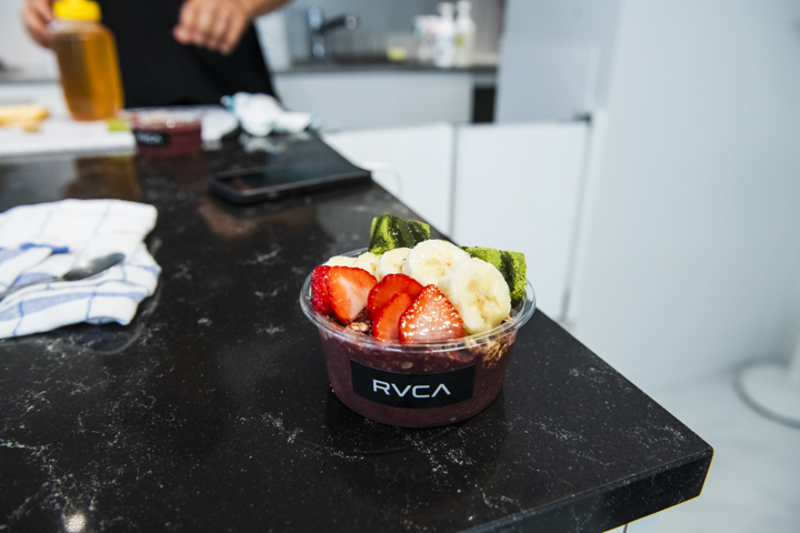 S: Since it's summertime, I wanted to cook something cold. During the planning, I realized blueberries are super expensive and strawberries are very limited in the summer. But RVCA helped me find the sources and all that. I wanted to do a Hawaii Japan collab. So I used strawberry, banana and matcha warabi mochi. Mochi is an important Japanese food and I wanted to make it the Rasta color for Hawaii (laugh). You know, red, gold and green. I'm really stoked and grateful that Kento (Takahashi) brought this idea and made it through.