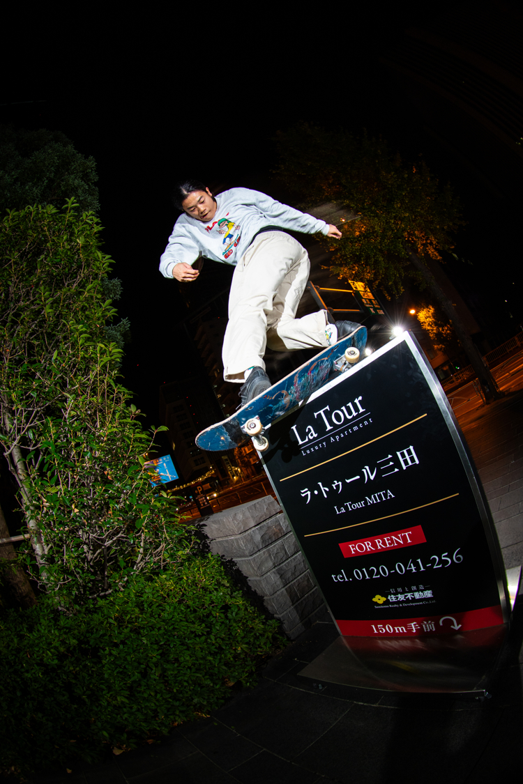 T: Rio was one of the first members to join Plant, and we’ve known each other for a long time. He was actually the first person to take me on a skate trip outside the city. He’s a great dude—super stylish and insanely good at skating—but somehow, despite that, he was always skating with a more beat-up board and clothes than me, and I had no money either. Seeing him like that as a high school kid made me feel like something wasn’t right. I used to wonder, “Why isn’t anyone giving this up-and-coming skater the support he deserves?” He couldn’t even get griptape, so he’d use sandpaper from a hardware store instead. I remember thinking back then, “If I ever start my own brand, Rio’s the first person I’m going to support.” So yeah, this part means a lot to me on a personal level. That’s why making Rio’s part this time felt kind of emotional—it’s crazy to think that day finally came. He’s a total beast. The guy doesn’t compromise, and he never gives up. Once he decides he’s going to land something, he sticks with it no matter what. Hot, cold, whatever—he’ll keep trying for hours. The craziest session was this line he did at a ledge spot. He goes kickflip noseslide into a nosegrind. That day, he skated for 7 straight hours with just one 30-minute break. In the end, he didn’t land it. Skated for 7 hours and still no make. But Rio didn’t even get discouraged—he was like, “Next time for sure!” That energy pushed me too. I was like, “Alright, I’ve gotta step up, too.” And the next time we went, he landed it clean in like 30 minutes. Filming with Rio was super intense—going back to the same spot over and over, skating for hours in the blazing heat. It was tough, but that’s what made it so rewarding when we finally got the clips. I hadn’t done much filming myself before this project. Our main filmer, Kazuha, shot about 80% of the video. But there were times when he couldn’t film or was working on his own part, so I had to step in. Toward the second half of Rio’s filming, I ended up shooting most of his stuff. And honestly, that’s how I really leveled up as a filmer. On that 7-hour day, the difference between how I was handling the camera at the beginning and at the end was night and day. That’s when I really started to enjoy filming. We’ve already started shooting the next video, and at this point I’m filming most of it myself. Thanks to Rio, I discovered how fun filming can be—and I’ve grown a lot technically, too.