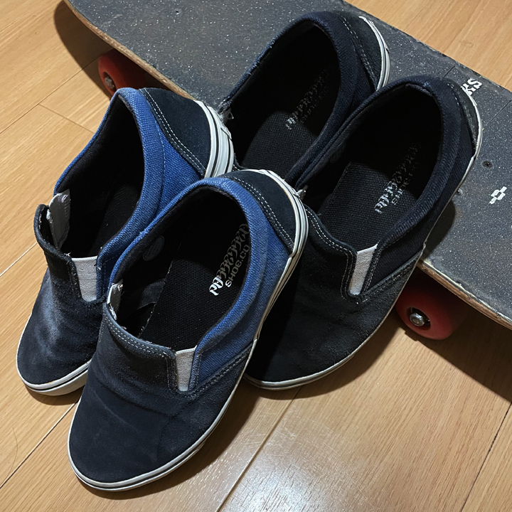 かく言う自分も実際に履くまでは不安に思うことも多く、長い間トライすることがありませんでした。というのも10代の頃。非スケートブランドのスリッポンで試しにスケートしてみたところ大大大失敗。衝撃が痛い、そっこーで穴が空く、タンの部分に当たるゴムも切れるの三重苦で2週間ほどでRIP。そもそもスケートシューズじゃないので当然なんですが、想定外の悲惨さにお手上げ。「オシャレは我慢」ともいかないことを学習したのでした。それから十数年、「騙されたと思って一度履いてみ」という仲間のアドバイスもあり、重い腰を上げて試してみたところ感動してしばらく愛用中。