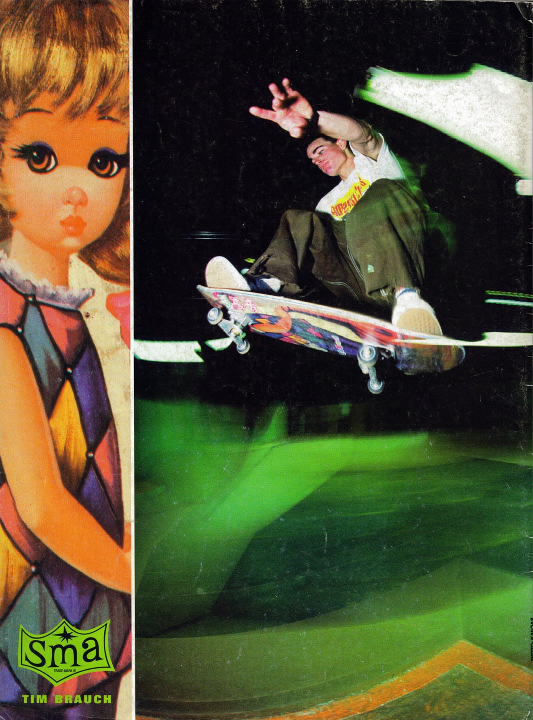 そのスケートボーダーの名前はティム・ブラウチ。'90年代初頭にSMAやSanta Cruzのプロとして活躍した正統派スケーターで、当時の流行のスタイルは程ほどにパークやストリート、ボウルにプールと何でもござれのまさにオールラウンダー。当時の個人的なイメージはとにかくエネルギッシュによく滑るスケーターで、そのスタイルはまるでリモートコントロールされてるんじゃないかってくらいに正確でスピーディ。中でも彼のブラントトリックは絶品で、ウィールがコーピングを越えた瞬間に空中に浮遊して、そこから巧みなボディコントロールでありとあらゆるコンビネーションを披露できる稀有な存在でした。そして何よりもその人格者としての一面、家族や親しい友人にはもちろんのこと、訪れる旅先で出会う多くのキッズやローカルたちへの優しい接し方は出会ったすべての人の心をとらえ、1999年5月9日に先天性の心臓疾患により25歳の若さでこの世を去った後も多くの人に愛され続けています。そして彼の偉業を讃え、カリフォルニアのスコッツバレーに建設されたTim Brauch Memorial Skateparkなどで毎年彼の名を冠したイベントが催され、彼を知る人はもちろん、現役の彼を知らない多くのキッズたちが集まりみんなで純粋にスケートを楽しんでいるようです。